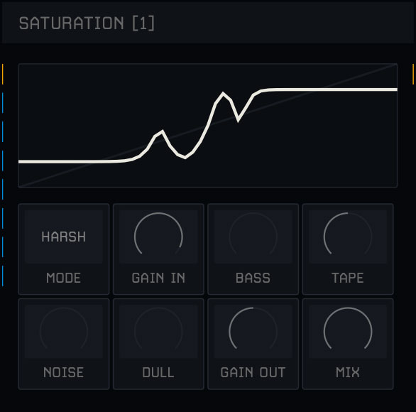 SATURATION:Tape saturation — 4 modes (Gently to Harsh), bass boost, noise, dull.