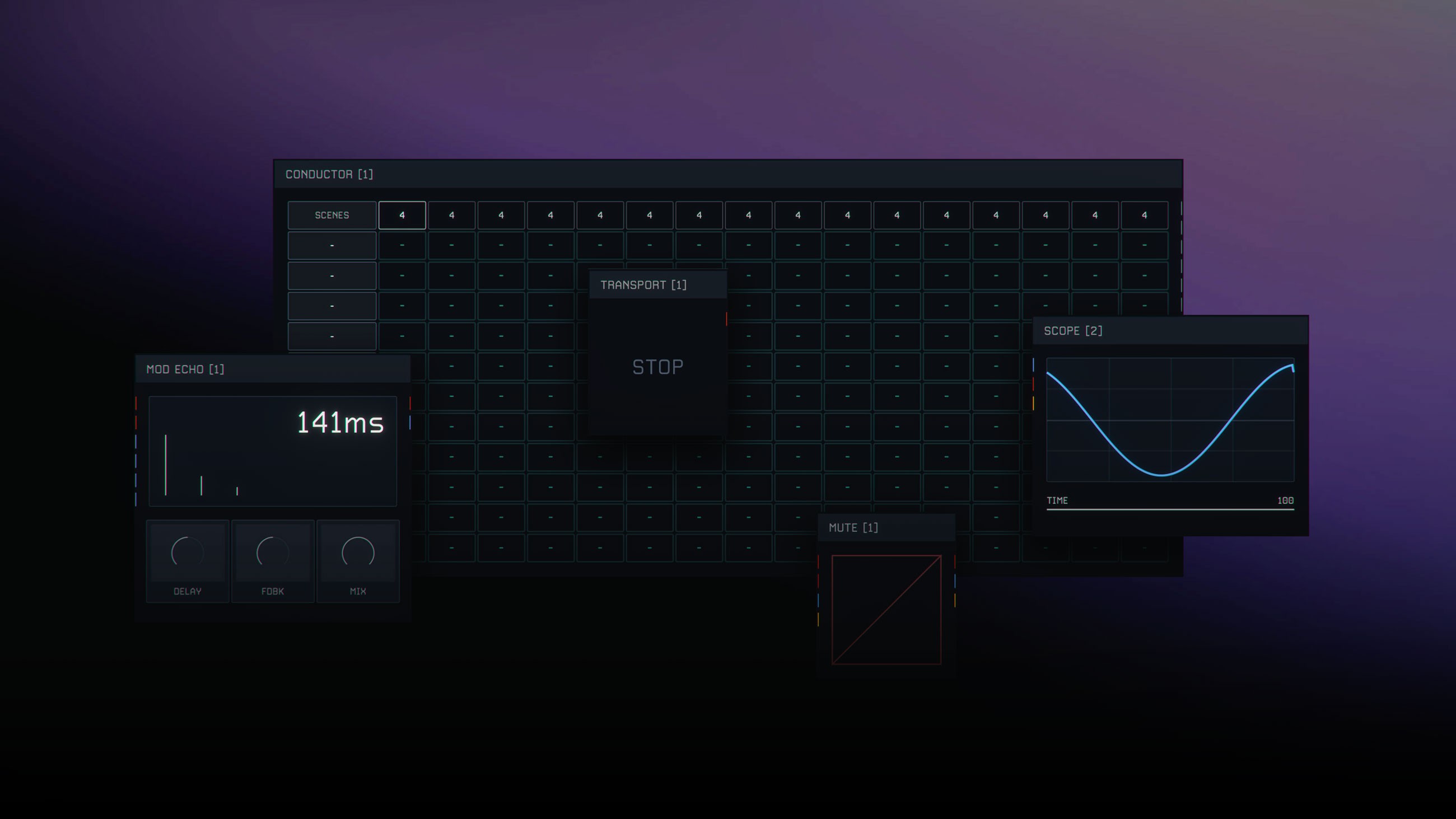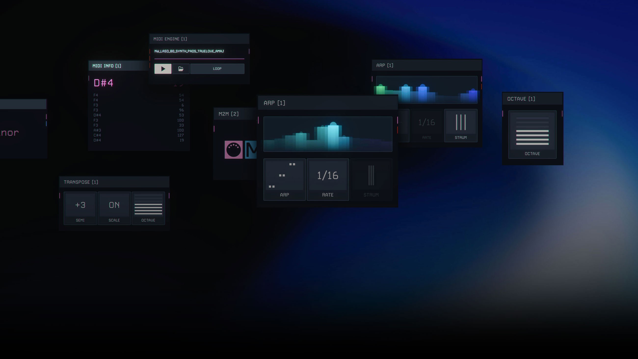 ARP takes held MIDI chords and spits them back as rhythmic patterns. 11 modes from simple up/down to spirals and random skips, all tempo-synced. Drop it between HARMONY and a synth for instant Tangerine Dream vibes. MIDI MERGE combines two MIDI streams into one. Layer two sequencers into a single synth or merge a keyboard with a sequencer. MIDI TO MOD bridges the MIDI and CV worlds by splitting MIDI into separate gate, pitch, and velocity signals for CV-only modules. MIDI ENGINE plays back standard MIDI files with transport sync. MIDI INFO is pure debugging, plug it in anywhere to see exactly what notes are flowing through. OCTAVE and TRANSPOSE shift pitch, with TRANSPOSE offering semitone precision and a scale lock feature that keeps transpositions in key. QUANTIZE quantize incoming midi to current project scale.