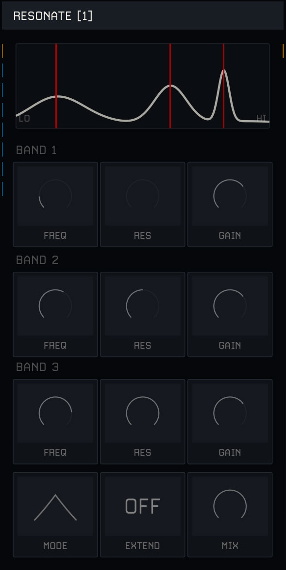 RESONATE: 3-band resonator — three tunable resonant peaks, 4 filter modes.