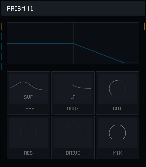 PRISM: 4 topologies (SVF/Ladder/Diode/Dirty) x 3 modes, drive, response curve.