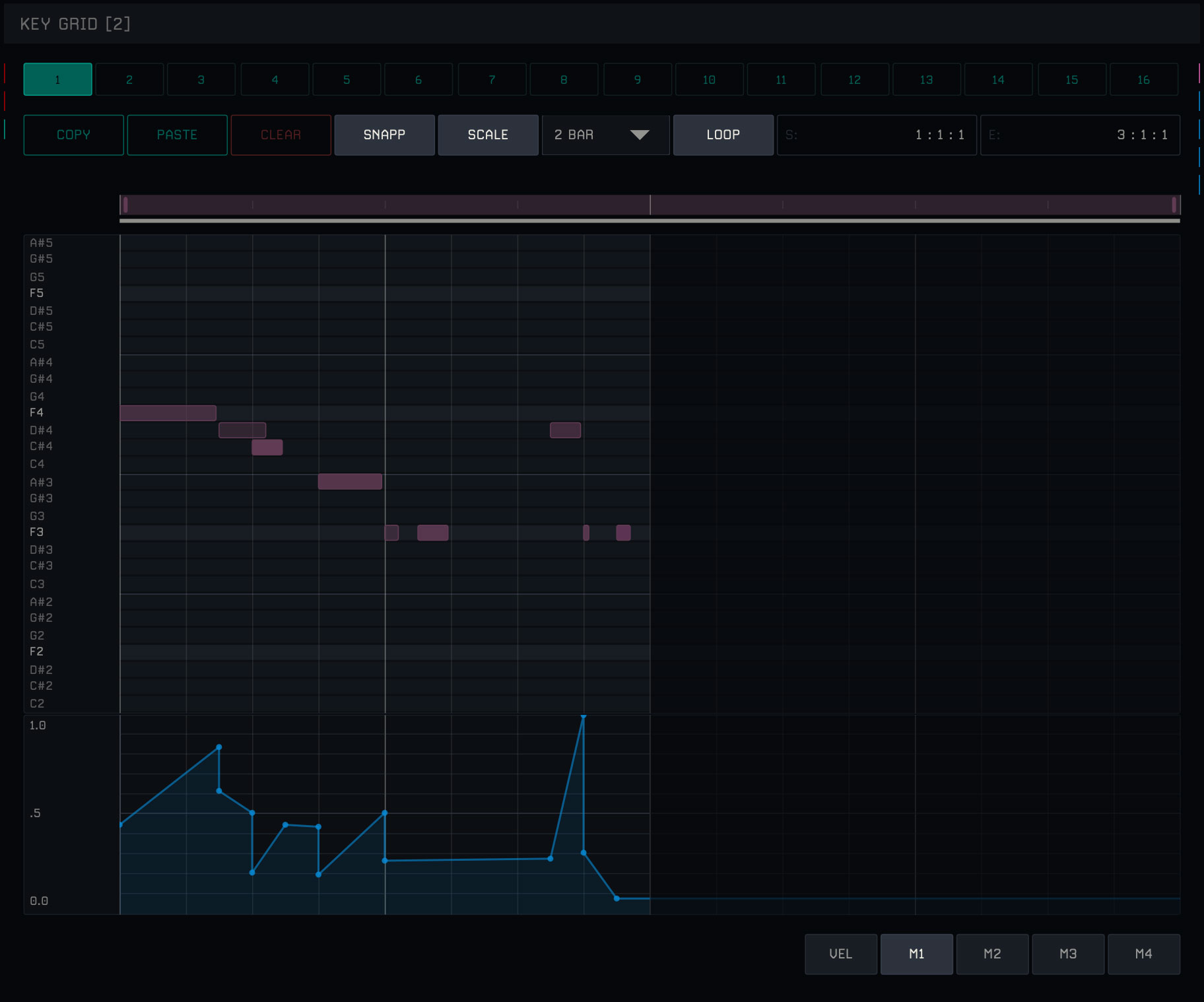 KEY GRID: Notes on a piano roll, with velocity and 4 CV automation lanes.