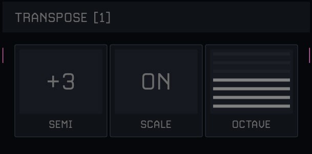TRANSPOSE: Shifts notes by semitones (-12/+12) and octaves (-3/+3) with scale lock.