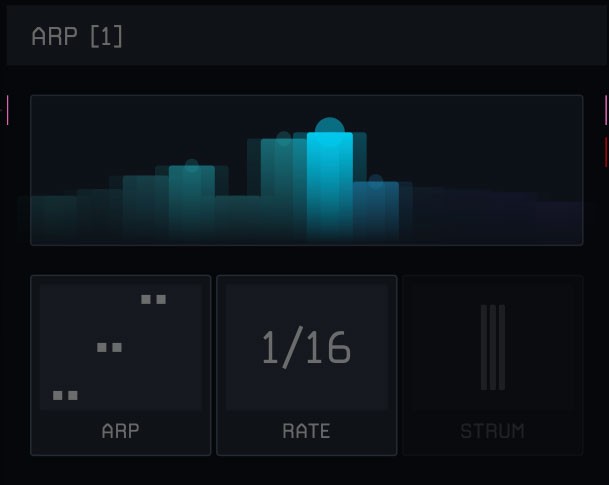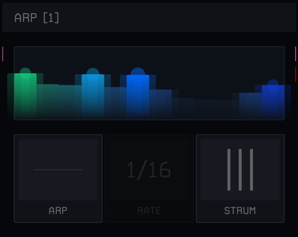 ARP : Turns held chords into arpeggiated patterns, 11 modes, tempo-synced. Strum function.