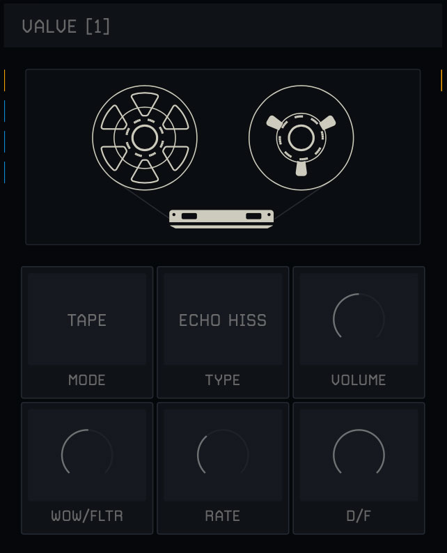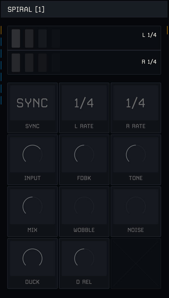 SPIRAL: Stereo tape delay — independent L/R times, wobble, tone, noise.