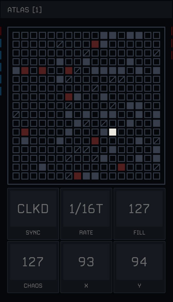 KEY GRID is the full piano roll — 600px wide, 4 octaves, click to place and drag notes, resize lengths, edit velocity. It also has 4 CV modulation lanes so you can draw parameter automation alongside your melody. DR GRID is the drum equivalent — a 5-voice trigger grid that pairs directly with TRUMMIS, the manual alternative to RHYTHM's generative patterns. SLICE GRID is purpose-built for the PIZZA sample slicer — it programs which slice plays when, with per-event control over pitch, reverse, stutter, and probability for breakbeat-style sample mangling.