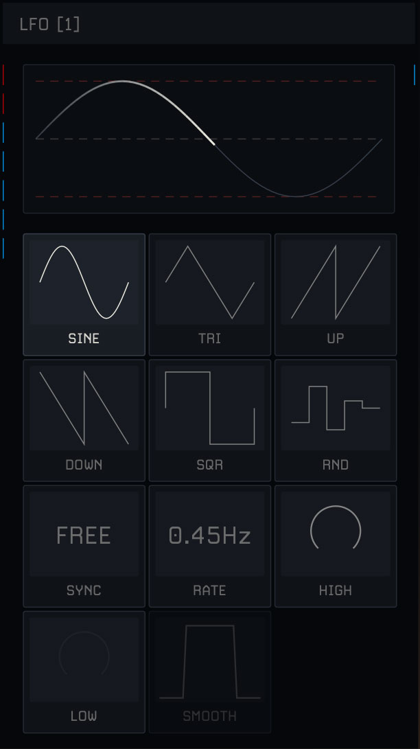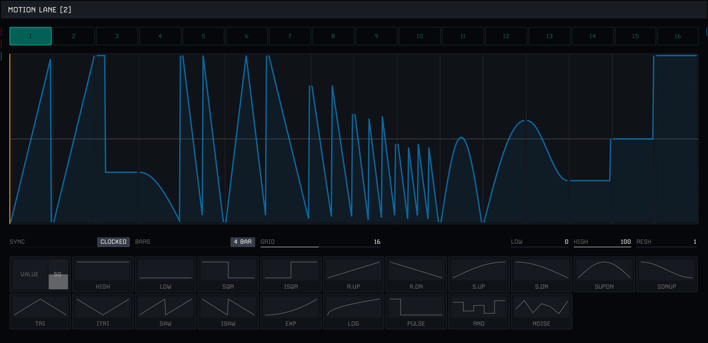 MOTION LANE: Segment-based modulation editor — draw curves visually, 32 segments, 16 patterns.