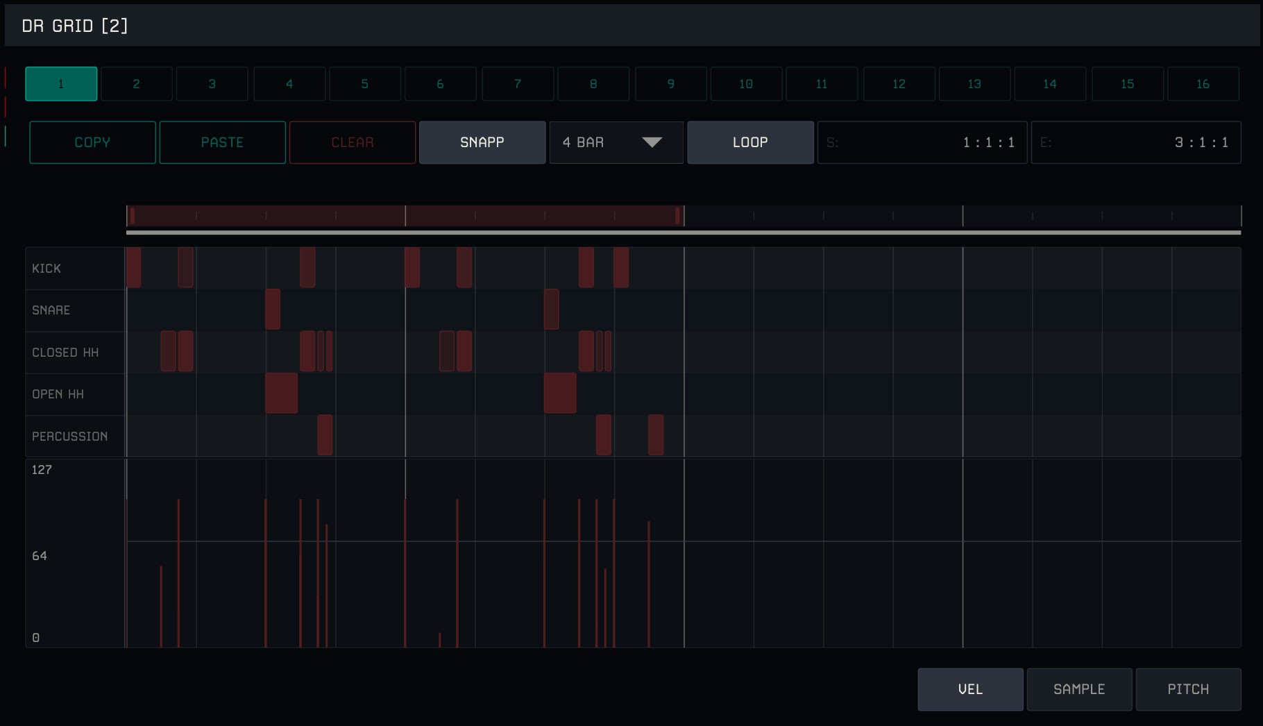 DR GRID: Per-voice trigger grid for kick/snare/hihat/openhat/perc.