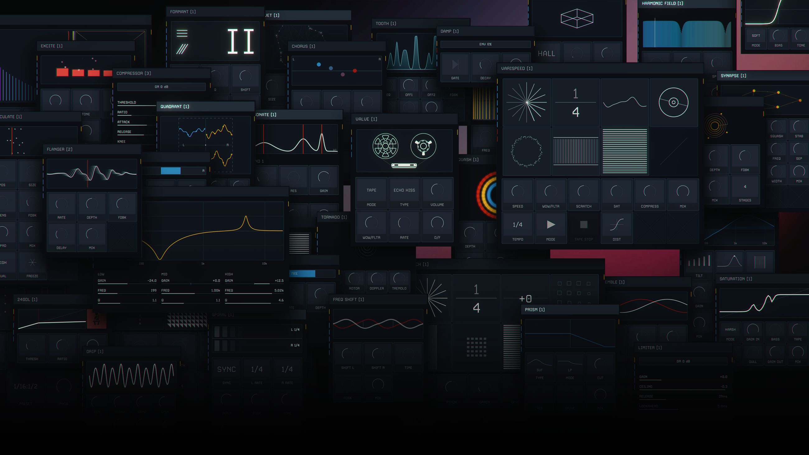 Four reverbs cover every vibe. DATTORRO for lush plates, ROOM for realistic spaces, VELVET for smooth FDN ambience, and DRIP for splattery spring dub. SPIRAL is the go-to delay with its tape character, while FREQ SHIFT creates alien pitch-cascading echoes. Filters range from the dead simple (FILTER) to the deeply weird (CHROMA's spectral FFT processing, HARMONIC FIELD's 122-notch phasing). Five flavors of dirt cover subtle tape warmth (SATURATION) through to 9-algorithm waveshaping (DISTORTION). SQUASH delivers the OTT sound that modern electronic music runs on. The modulation effects cover all the classics: chorus, phaser, flanger, tremolo, plus TONE TORNADO's Leslie and QUADRANT's ring mod for the weird shit. PARTICULATE, STRETCH, STUTTER, and VARISPEED handle granular and time-based mangling.
