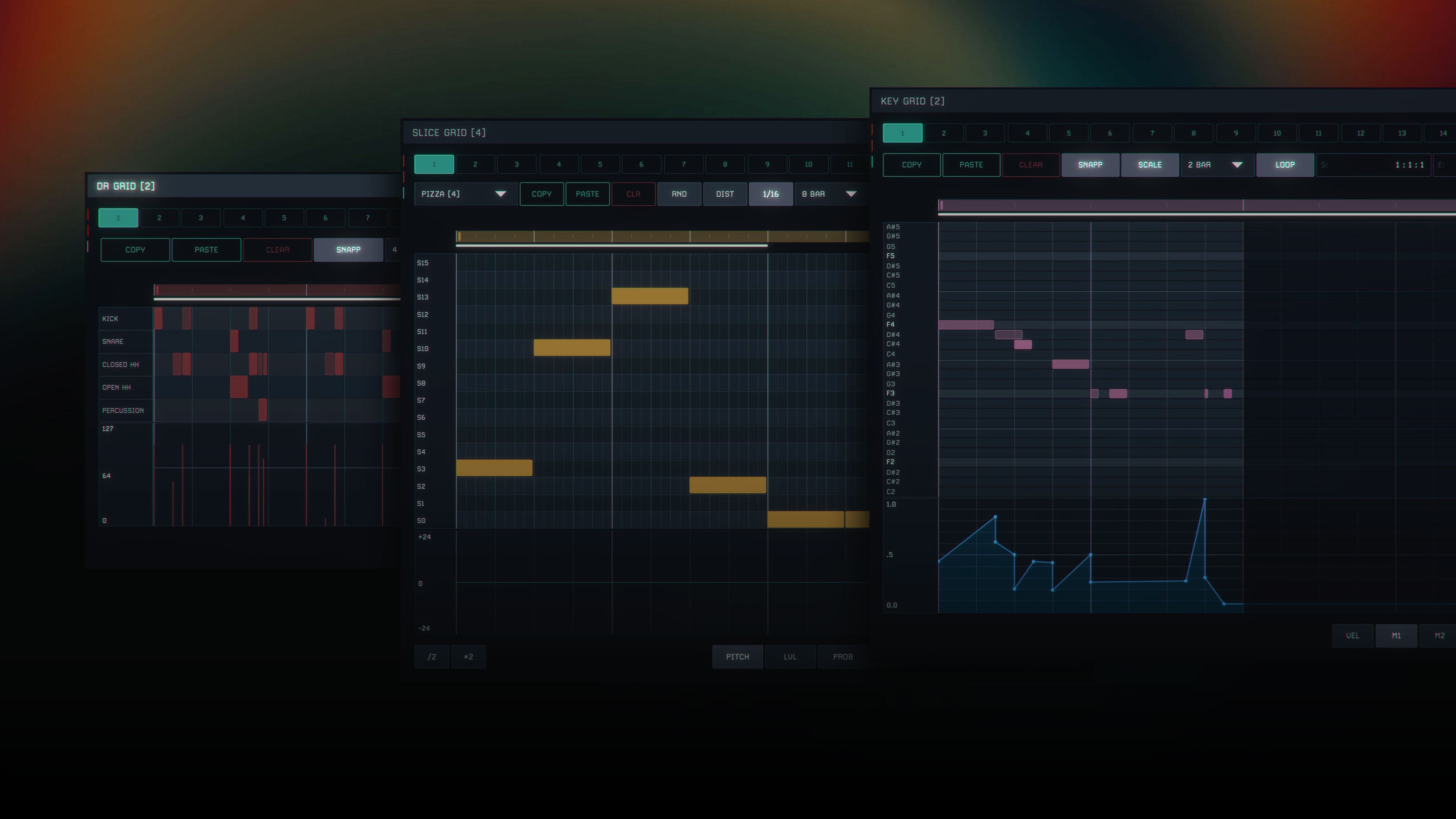 KEY GRID is the full piano roll. 4 octaves, click to place and drag notes, resize lengths, edit velocity. It also has 4 CV modulation lanes so you can draw parameter automation alongside your melody. DR GRID is the drum equivalent. A 5-voice trigger grid that pairs directly with TRUMMIS, the manual alternative to RHYTHM's generative patterns. SLICE GRID is purpose-built for the PIZZA sample slicer. It programs which slice plays when, with per-event control over pitch, reverse, stutter, and probability for breakbeat-style sample mangling.