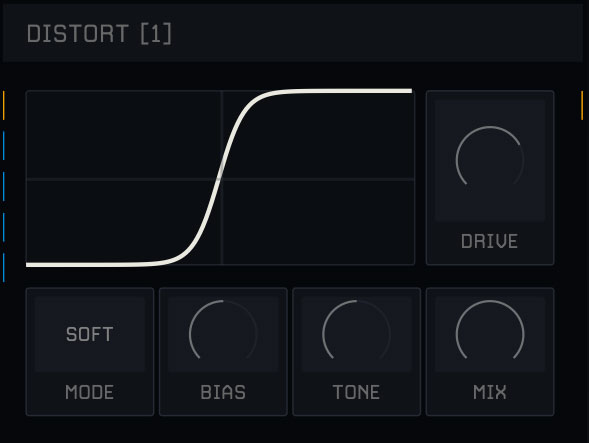 DISTORTION: 9 waveshaper algorithms with transfer curve display and bias control.