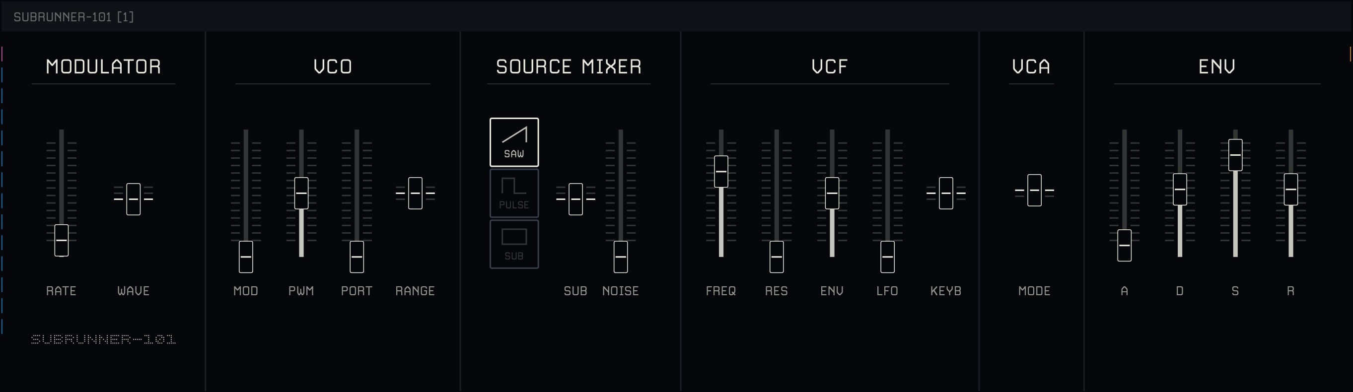 SUBRUNNER-101: Roland SH-101. Punchy, direct bass & leads. The workhorse.