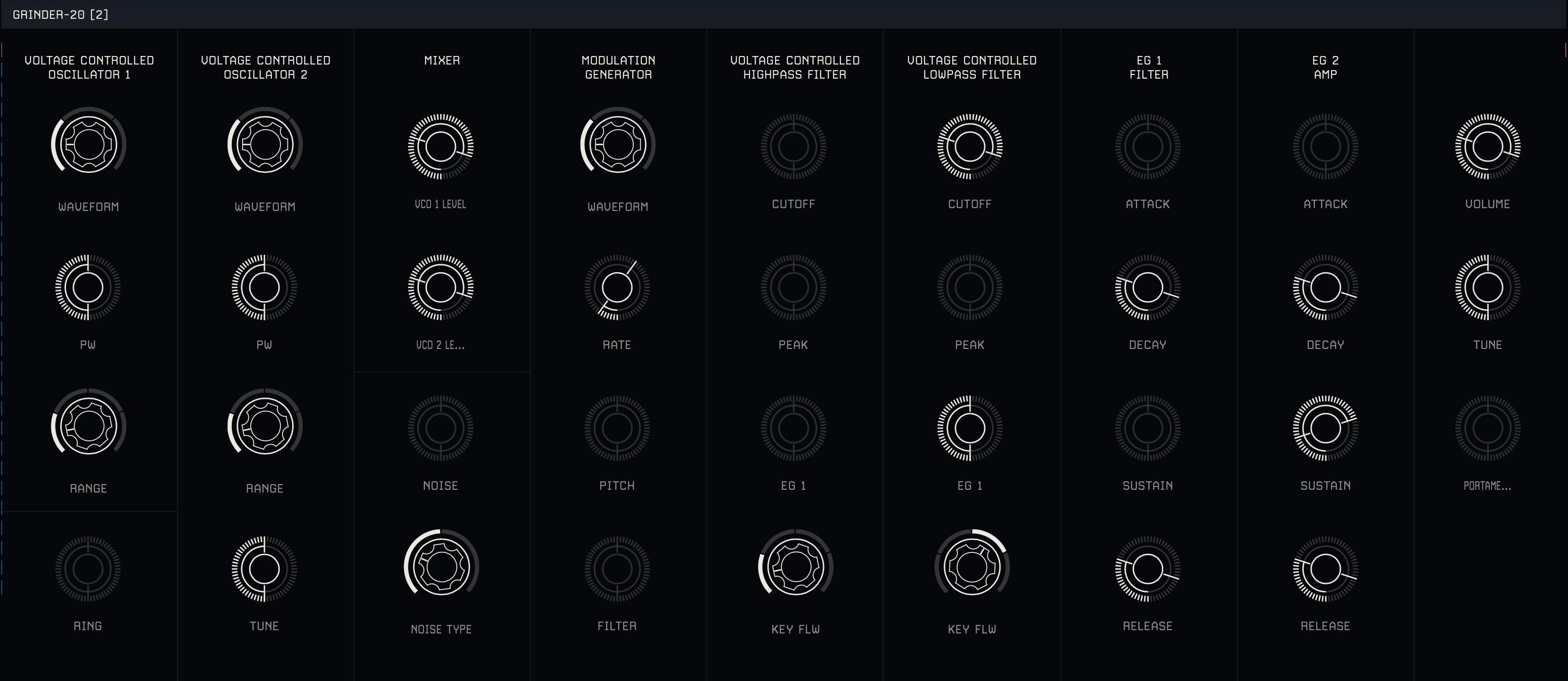 GRINDER-20: Korg MS-20. Aggressive, screaming dual filters. The raw one.