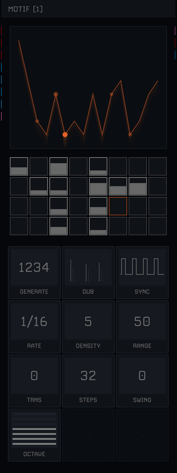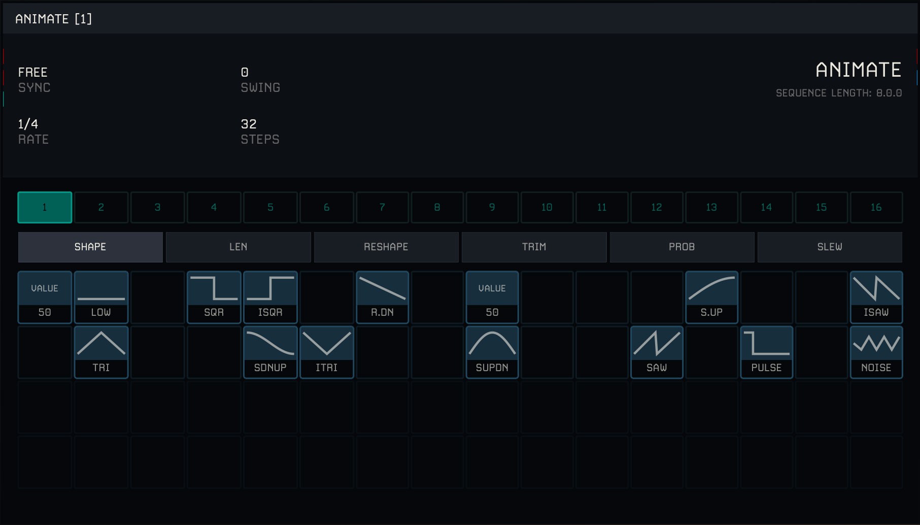 ANIMATE: Per-step waveform shapes (20 types) for parameter automation.