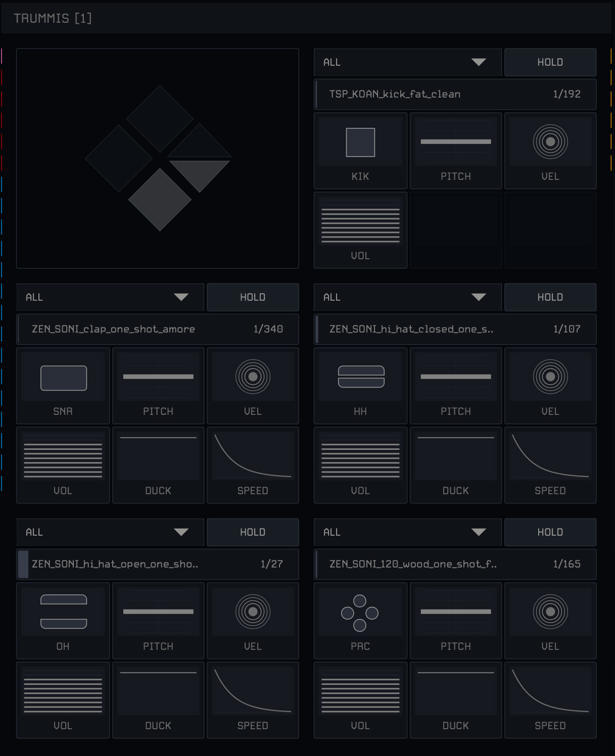 TRUMMIS: 5-voice drum sampler (kick/snare/hihat/OH/perc), 6 audio outs, kick ducking.