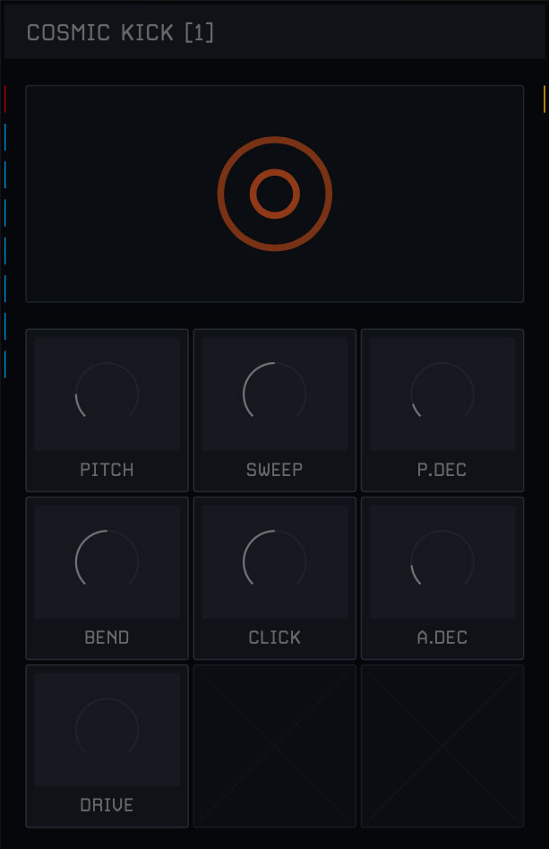 COSMIC KICK: Dedicated kick drum synthesizer with pitch sweep and drive.