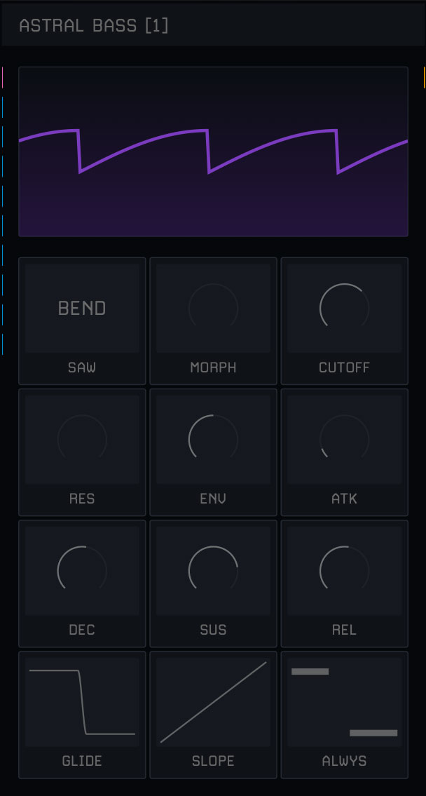 ASTRAL BASS: 5 morphable saw-variant waveforms, dedicated bass synth with filter envelope.