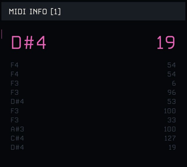 MIDI INFO: Displays incoming note names and velocities in real-time.