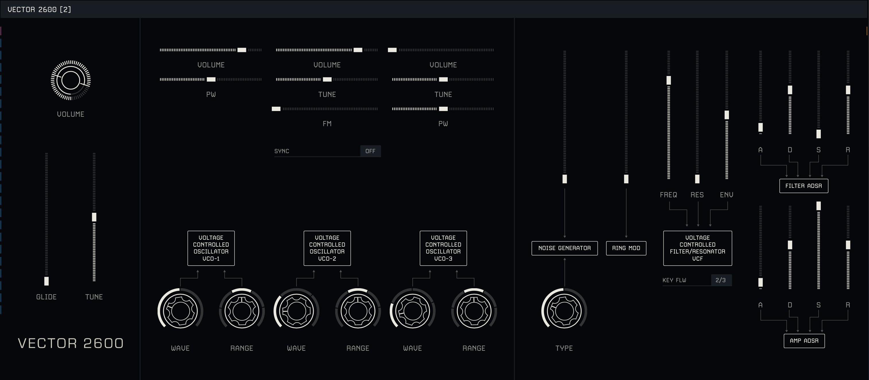 VECTOR 2600: ARP 2600. Semi-modular, 3 VCOs, ring mod. The sci-fi synth.