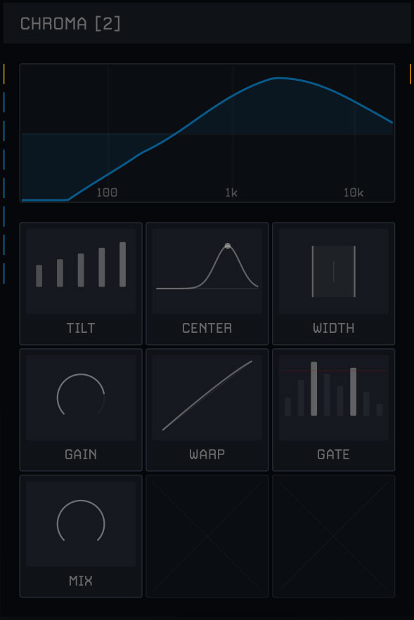 CHROMA: Spectral STFT filter — tilt/center/width/warp/gate in the frequency domain.