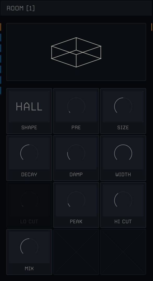 ROOM: Room simulation — 4 shapes (Small/Medium/Hall/Cathedral), 3-band EQ on tail.