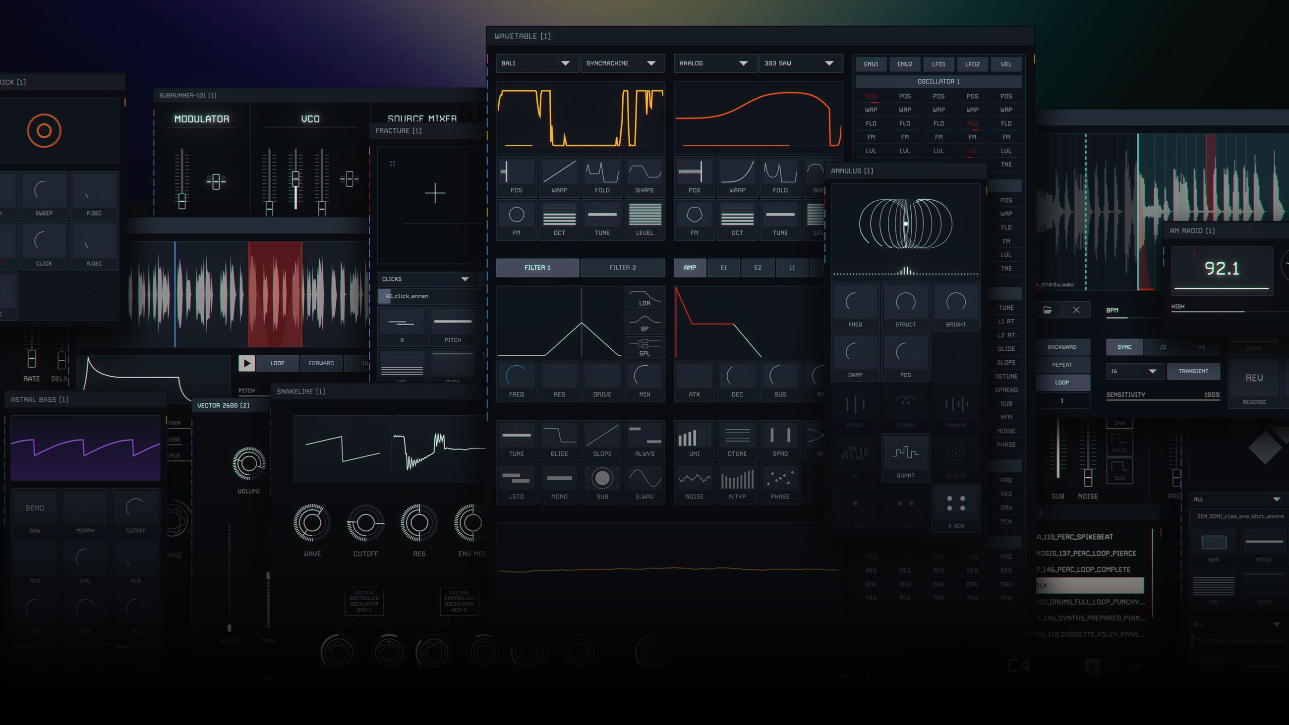 The classic emulations cover the golden age of analog. From the Juno's lush chorus to the MS-20's screaming filter to the 303's acid squelch. WAVETABLE is the modern powerhouse with its dual oscillators, mod matrix, and wavetable scanning. For samples, TRUMMIS and FRACTURE are your drum machines, PIZZA chops loops into sliceable breakbeats, and LOOPER turns any audio file into a playable instrument. ANNULUS bring physical modeling for sounds that don't come from traditional oscillators.