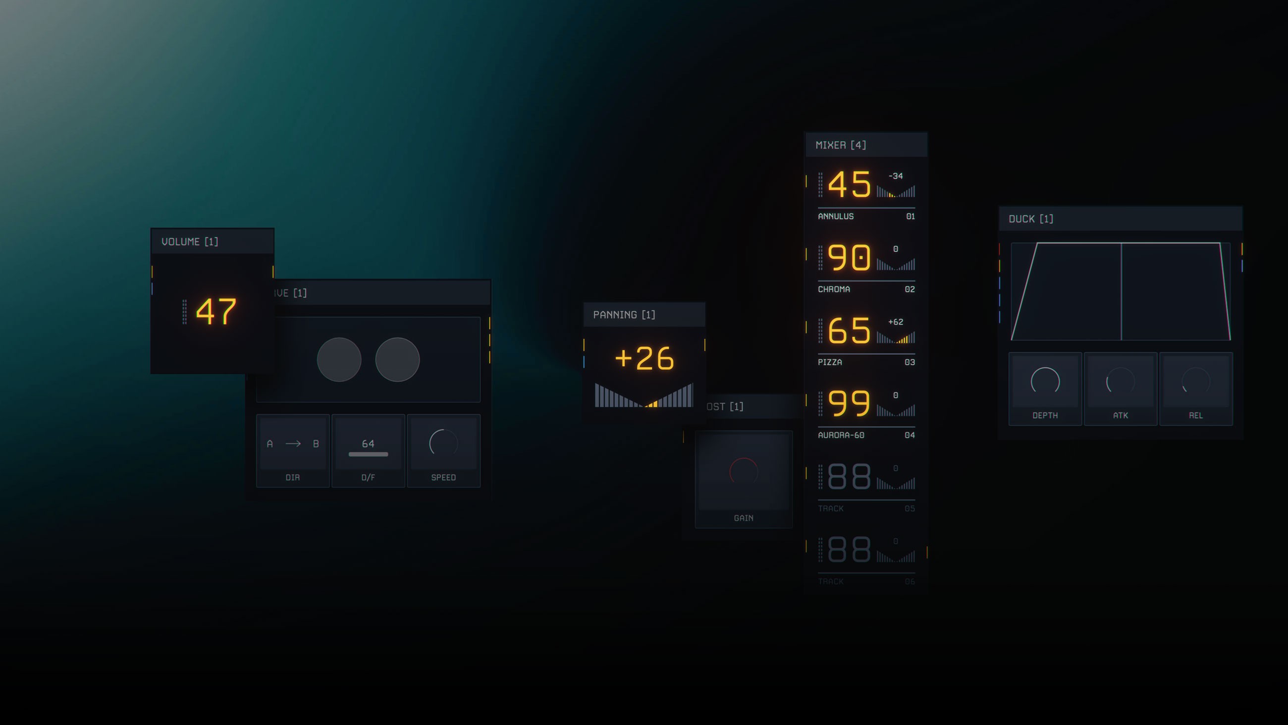 MIXER is the one you'll use in every single patch. 6 channels with source name display so you always know what's plugged in. VOLUME doubles as a VCA when you feed its CV input with an envelope. BOOST pushes past unity gain when something needs to be louder than loud. DUCK is your standard sidechain pumping, while CARVE does the same thing but fancier. Bidirectional duck/follow between two signals with separate A, B, and mix outputs.