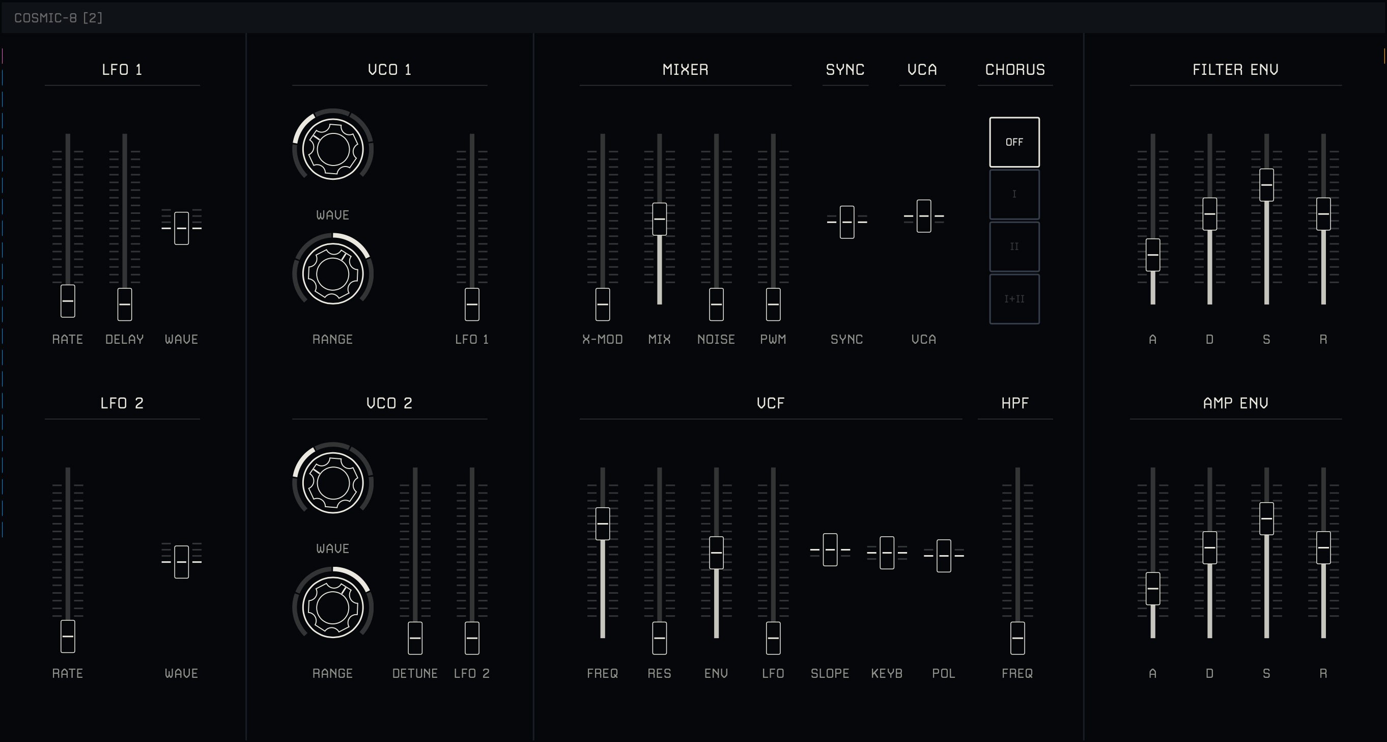 COSMIC-8: Roland Jupiter-8. Massive dual-osc pads & leads. The king.