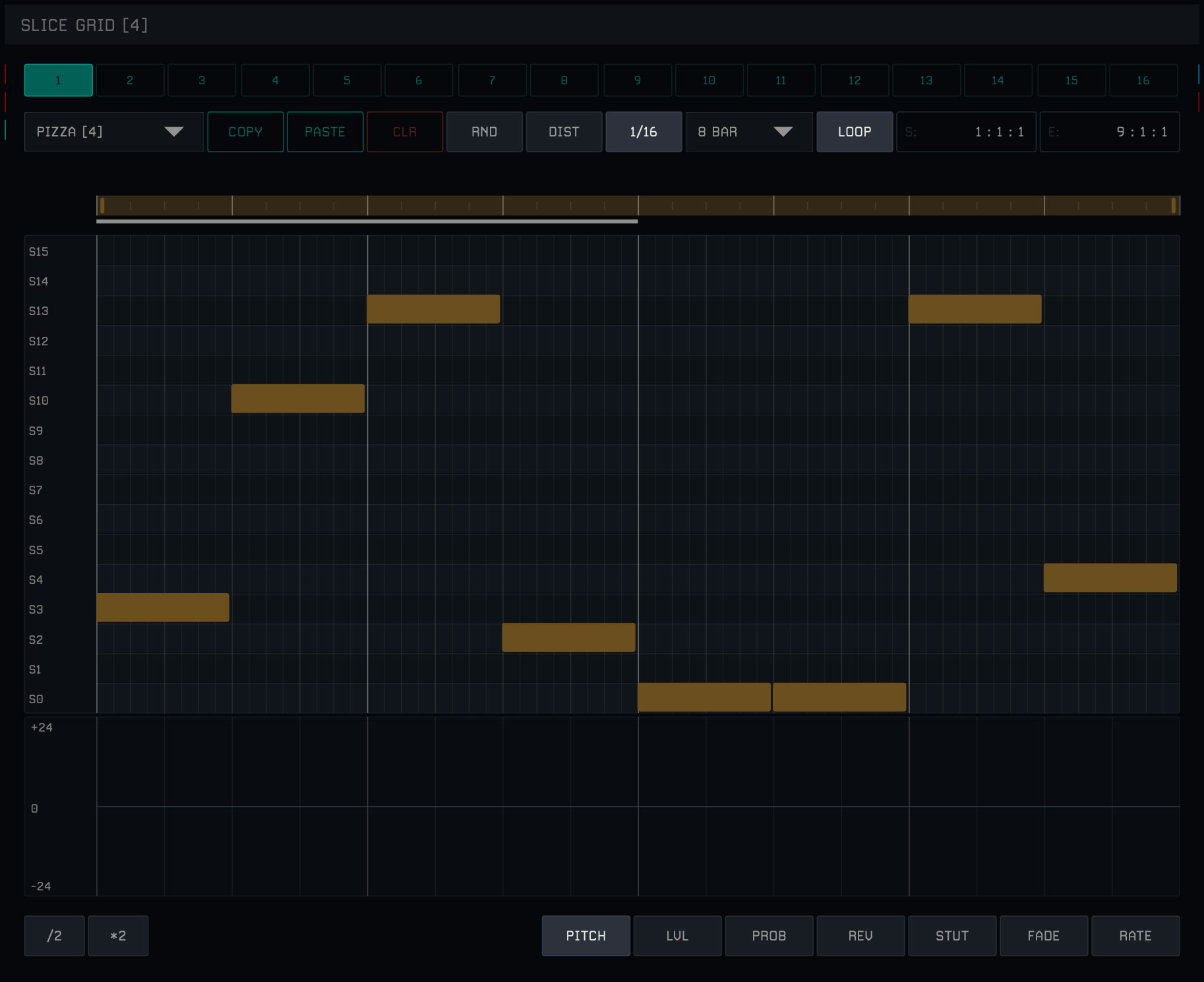 SLICE GRID: Slice events for PIZZA with pitch/level/probability/reverse/stutter per hit.