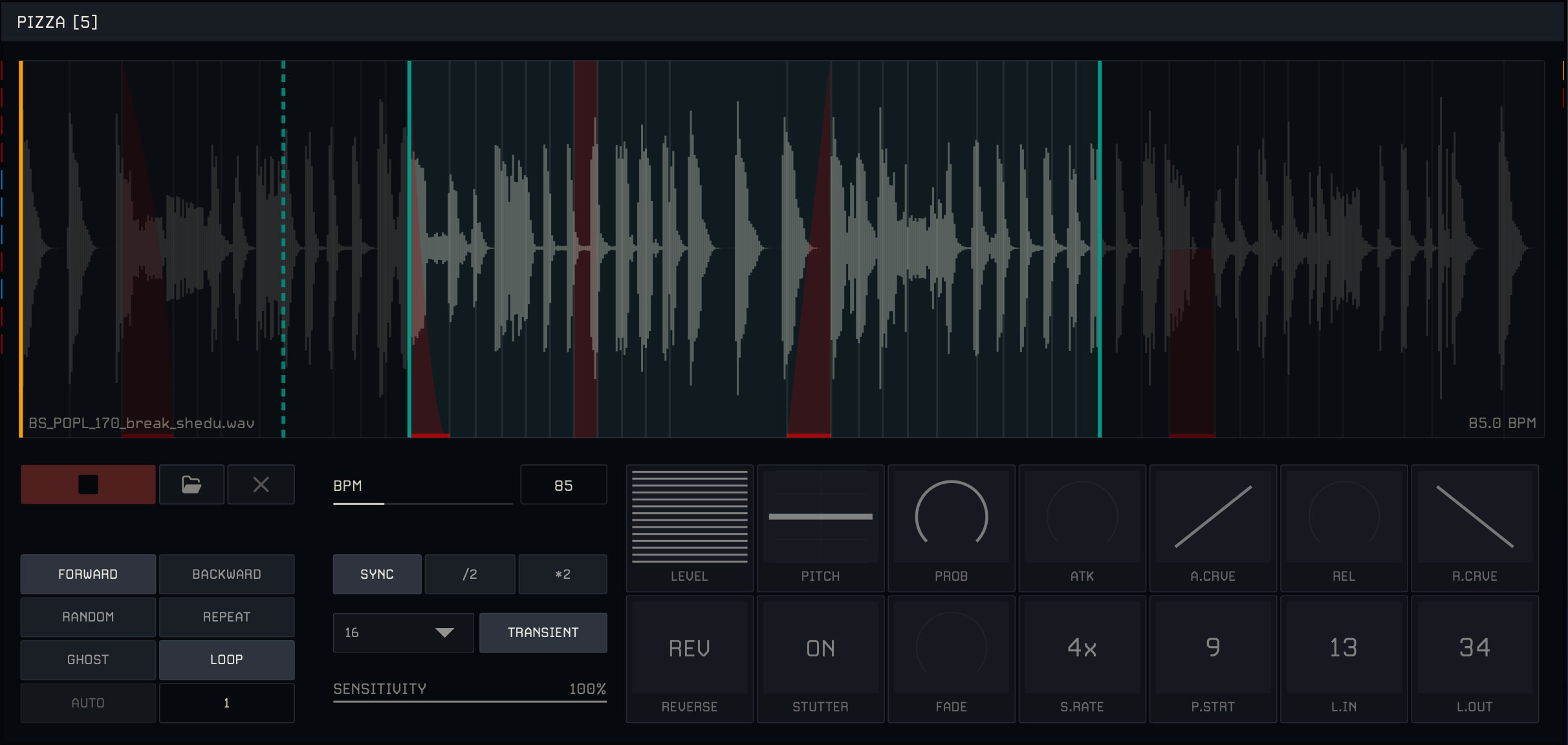 PIZZA: Slice sample chopper with per-slice modulation — breakbeat central.