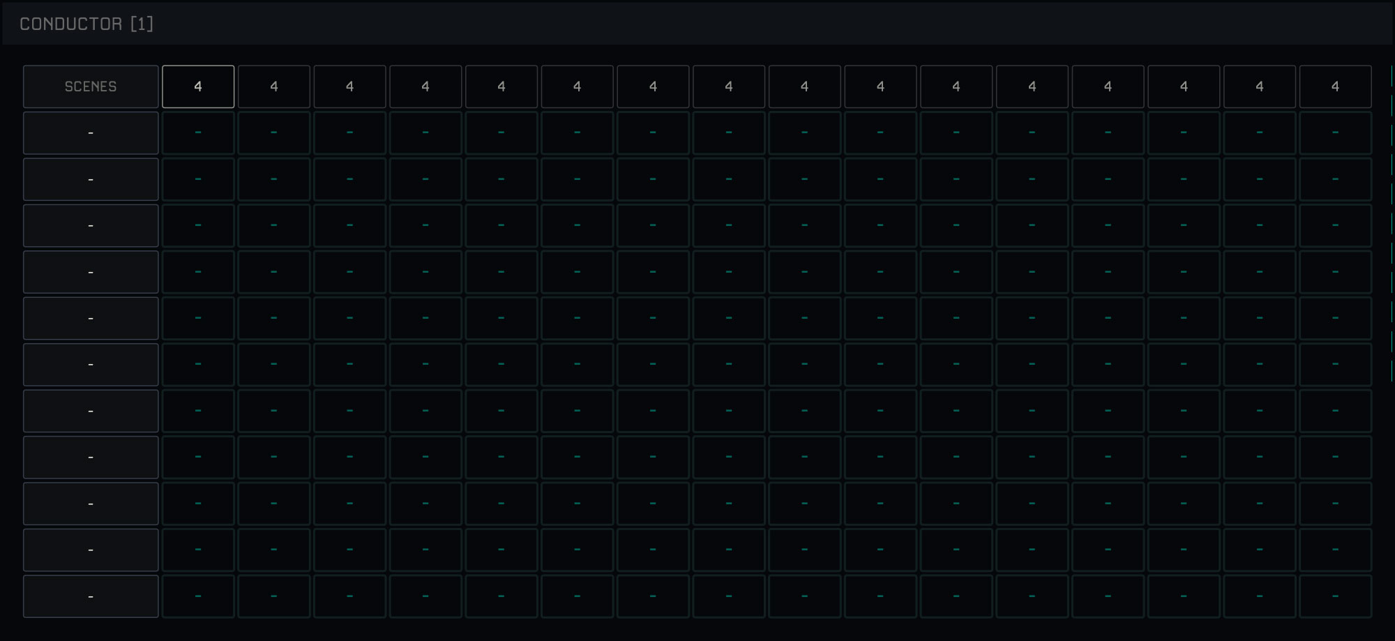 CONDUCTOR: Song arranger — 16 scenes with bar lengths, links to 11 sequencer tracks for pattern changes.