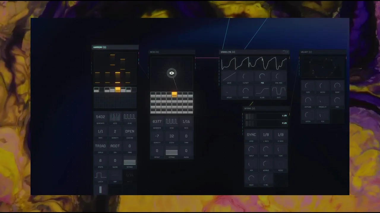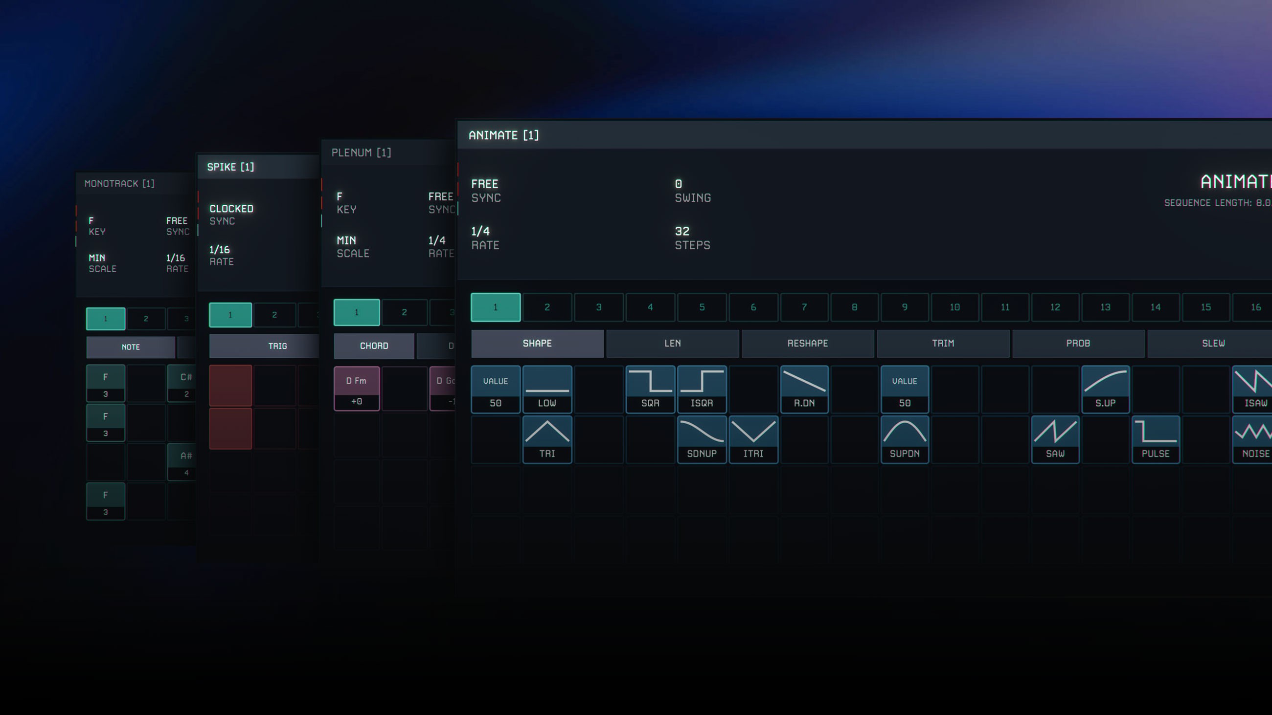 PLENUM is the heavyweight. A polyphonic chord sequencer with 20 mood palettes that define the harmonic character, plus per-step control over chord type, velocity, strum, and arpeggio style. Think of it as the manual counterpart to HARMONY. MONOTRACK is the simplest of the bunch. A straightforward monophonic step sequencer for bass lines and leads where you just want to punch in notes. ANIMATE sequences CV shapes instead of notes. Each step outputs a waveform (sine, triangle, saw, etc.) making it a programmable modulation source that stays locked to the beat. SPIKE is the trigger specialist with 5 edit modes (trigger, duration, length, ratchet, probability) across up to 64 steps. When you need drum fills, rolls, or evolving gate patterns, this is the one.