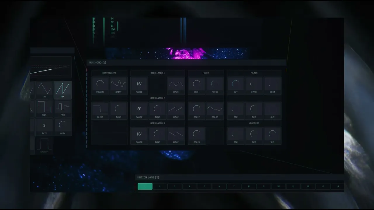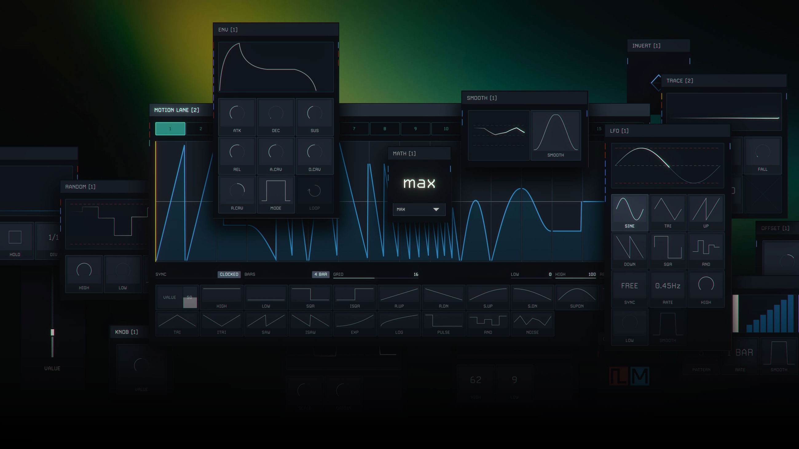 MOTION LANE: Segment-based modulation editor. Draw curves visually, 32 segments, 16 patterns.